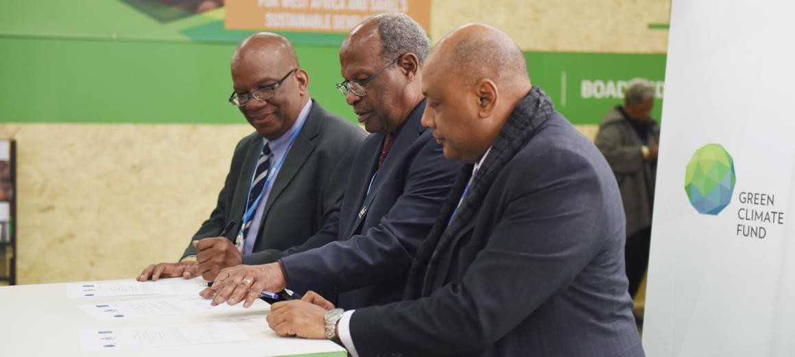 Intern, Mr. Mahendra Saywack assisted the Caribbean Community Climate Change Centre (CCCCC) in preparing a readiness proposal for the Government of Guyana to access the Green Climate Fund. This was approved for funding of US$300,000 and the Grant Agreement was signed in December 2015 on the sidelines of COP 21 in Paris. H.E. Raphael Trotman, Minister of Governance of the Department of Natural Resources and Environment, signed on behalf of Guyana in the presence of H.E. Winston Jordan, the Guyanese Minister of Finance. Ousseynou Nakoulima, Director of Country Programming, signed on behalf of the Fund.
