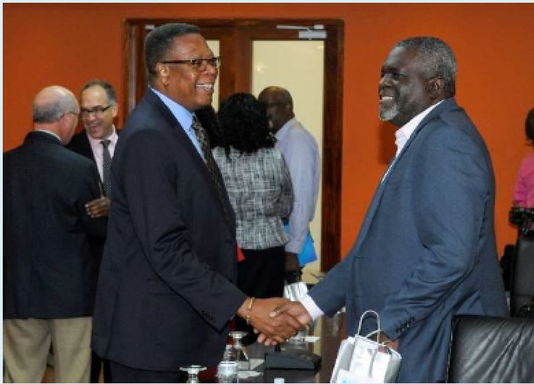 | Mr. Francis McBarnette, Resident Representative Barbados, Organization for American States (OAS) (L) and Mr. Devon Rowe, Director, Caribbean Centre for Development Administration (CARICAD) at the launch of CCRIF’s 10th Anniversary celebrations on February 20, 2017 at the CDB, Barbados |
