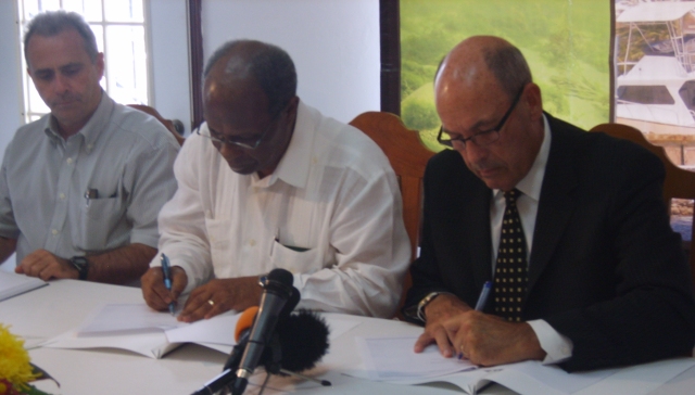 British High Commissioner to Belize, Mr Patrick Ashworth (at left) observes as Dr Kenrick Leslie, CCCCC Director, and Mr Milo Pearson, CCRIF Executive Chairman, sign a Memorandum of Understanding between the Caribbean Community Climate Change Centre and the Caribbean Catastrophe Risk Insurance Facility.